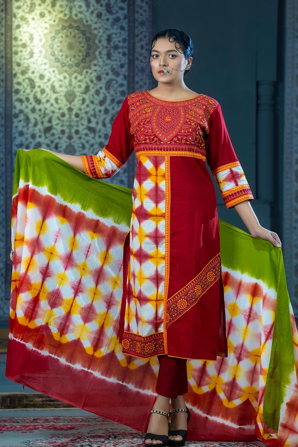 Elevate your everyday style with this stunning maroon cotton three piece set from Bishworang. Crafted from soft and breathable cotton, this outfit features a beautiful blend of handwork, tie-dye patterns, and detailed patchwork. The rich maroon shade adds depth and elegance, making it a perfect choice for those who appreciate traditional artistry with a modern touch.