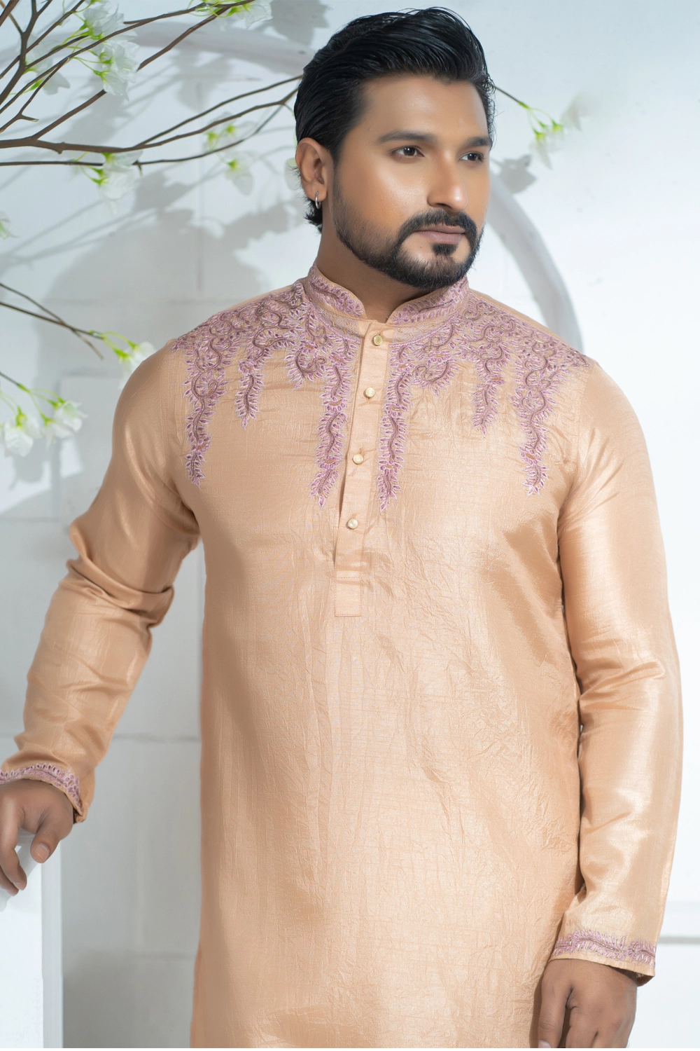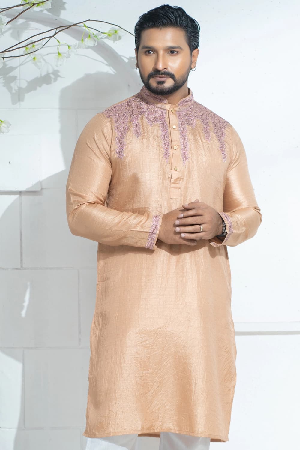 Stay stylish and comfortable with this cream Panjabi from BishwoRang. Made from soft Andy Cotton, it features fine cutwork and patchwork detailing—perfect for festive and formal occasions.