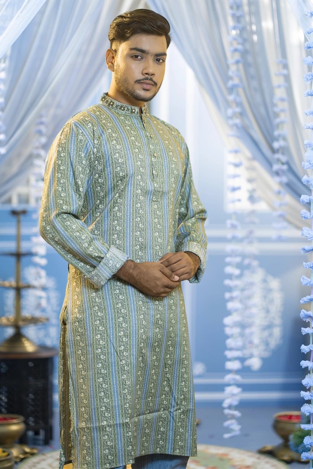 Stay stylish and comfortable with this Panjabi from BishwoRang. Made from soft Andy Cotton, it features fine cutwork and patchwork detailing—perfect for festive and formal occasions.