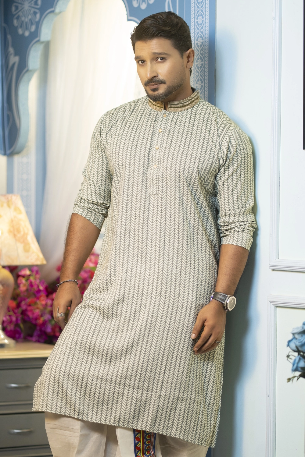 Stay stylish and comfortable with this Panjabi from BishwoRang. Made from soft Andy Cotton, it features fine cutwork and patchwork detailing—perfect for festive and formal occasions.
