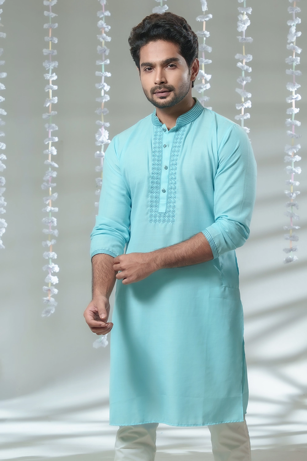 Stay stylish and comfortable with this Panjabi from BishwoRang. Made from soft Andy Cotton, it features fine cutwork and patchwork detailing—perfect for festive and formal occasions.