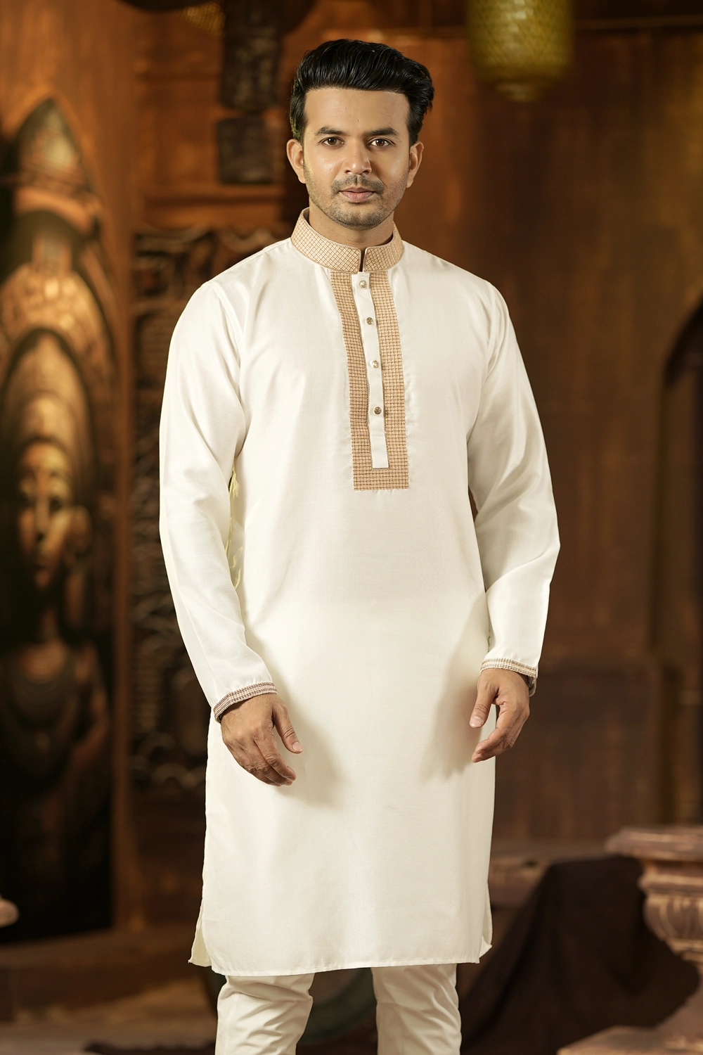 Stay stylish and comfortable with this Panjabi from BishwoRang. Made from soft Andy Cotton, it features fine cutwork and patchwork detailing—perfect for festive and formal occasions.