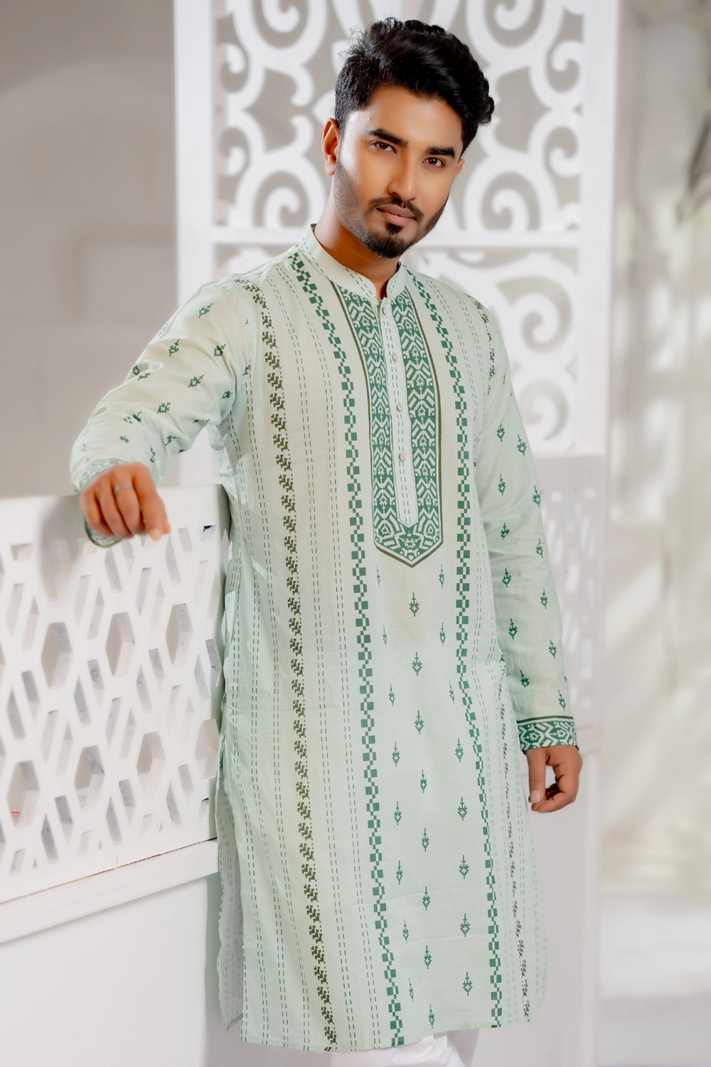 Stay stylish and comfortable with this cream Panjabi from BishwoRang. Made from soft Andy Cotton, it features fine cutwork and patchwork detailing—perfect for festive and formal occasions.