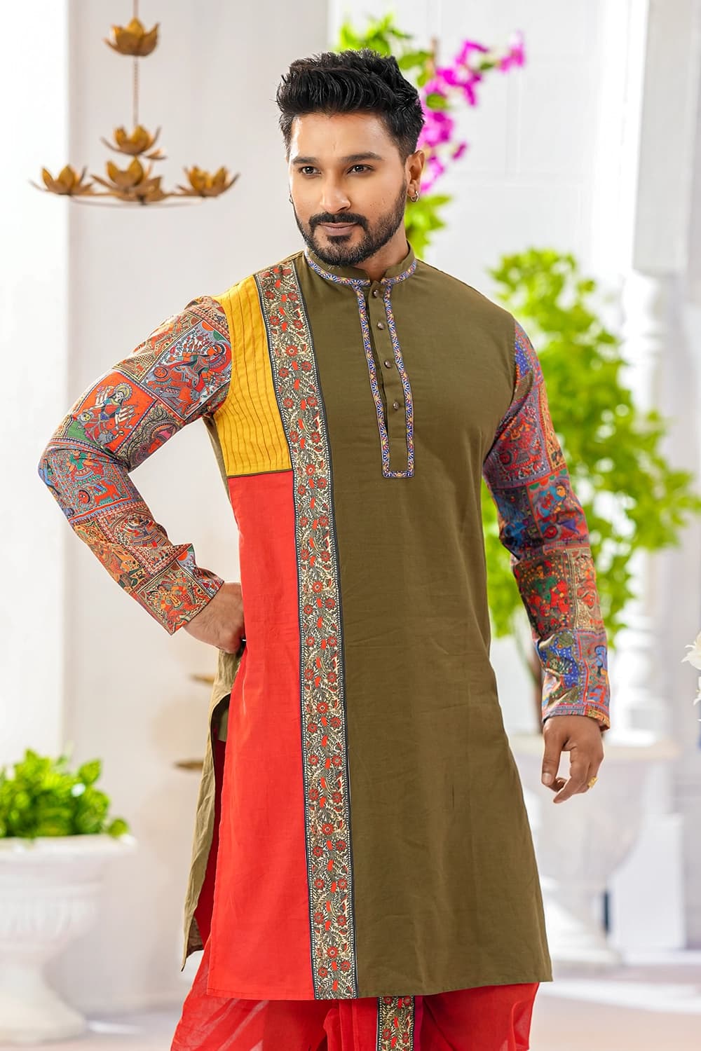 Stay stylish and comfortable with this Panjabi from BishwoRang. Made from soft Andy Cotton, it features fine cutwork and patchwork detailing—perfect for festive and formal occasions.