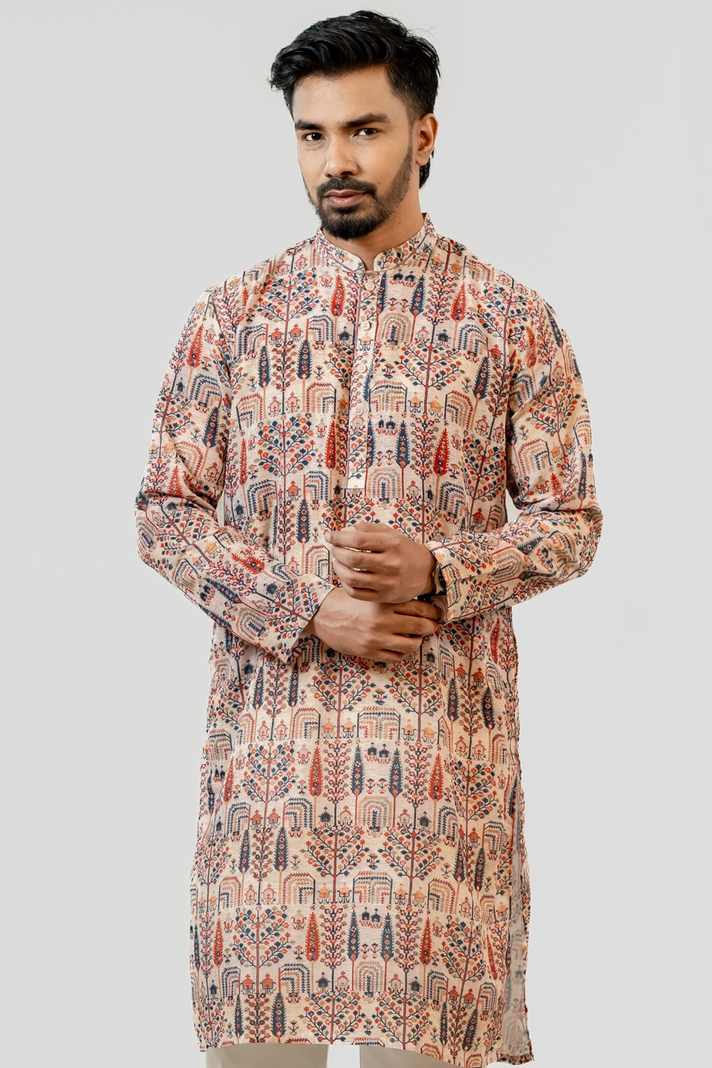Stay stylish and comfortable with this cream Panjabi from BishwoRang. Made from soft Andy Cotton, it features fine cutwork and patchwork detailing—perfect for festive and formal occasions.