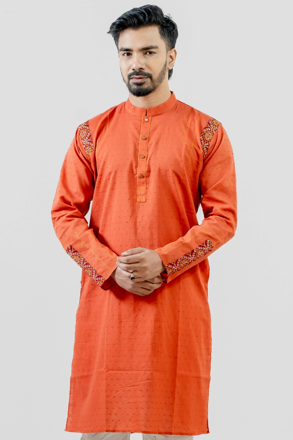 Stay stylish and comfortable with this cream Panjabi from BishwoRang. Made from soft Andy Cotton, it features fine cutwork and patchwork detailing—perfect for festive and formal occasions.