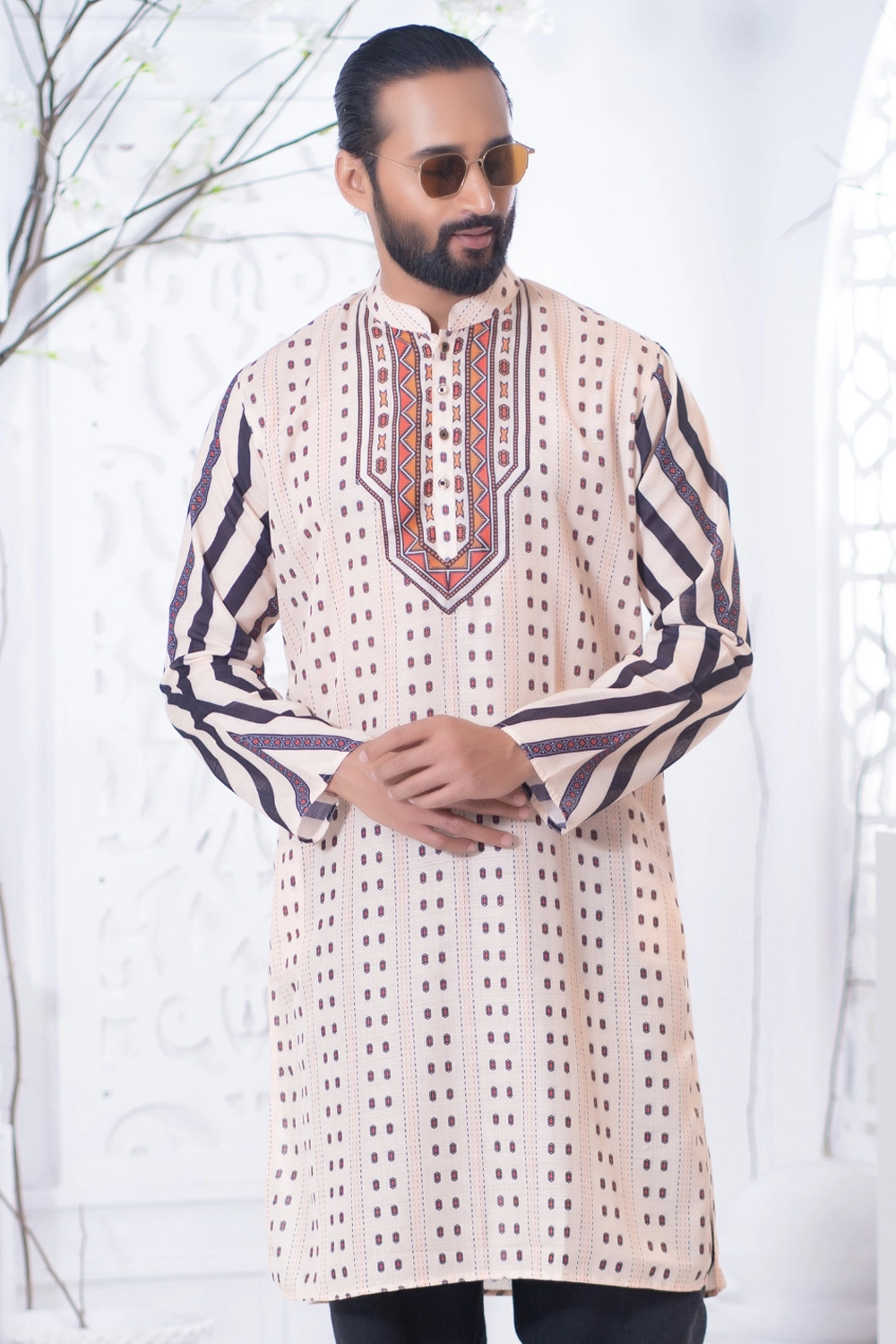 Stay stylish and comfortable with this cream Panjabi from BishwoRang. Made from soft Andy Cotton, it features fine cutwork and patchwork detailing—perfect for festive and formal occasions.