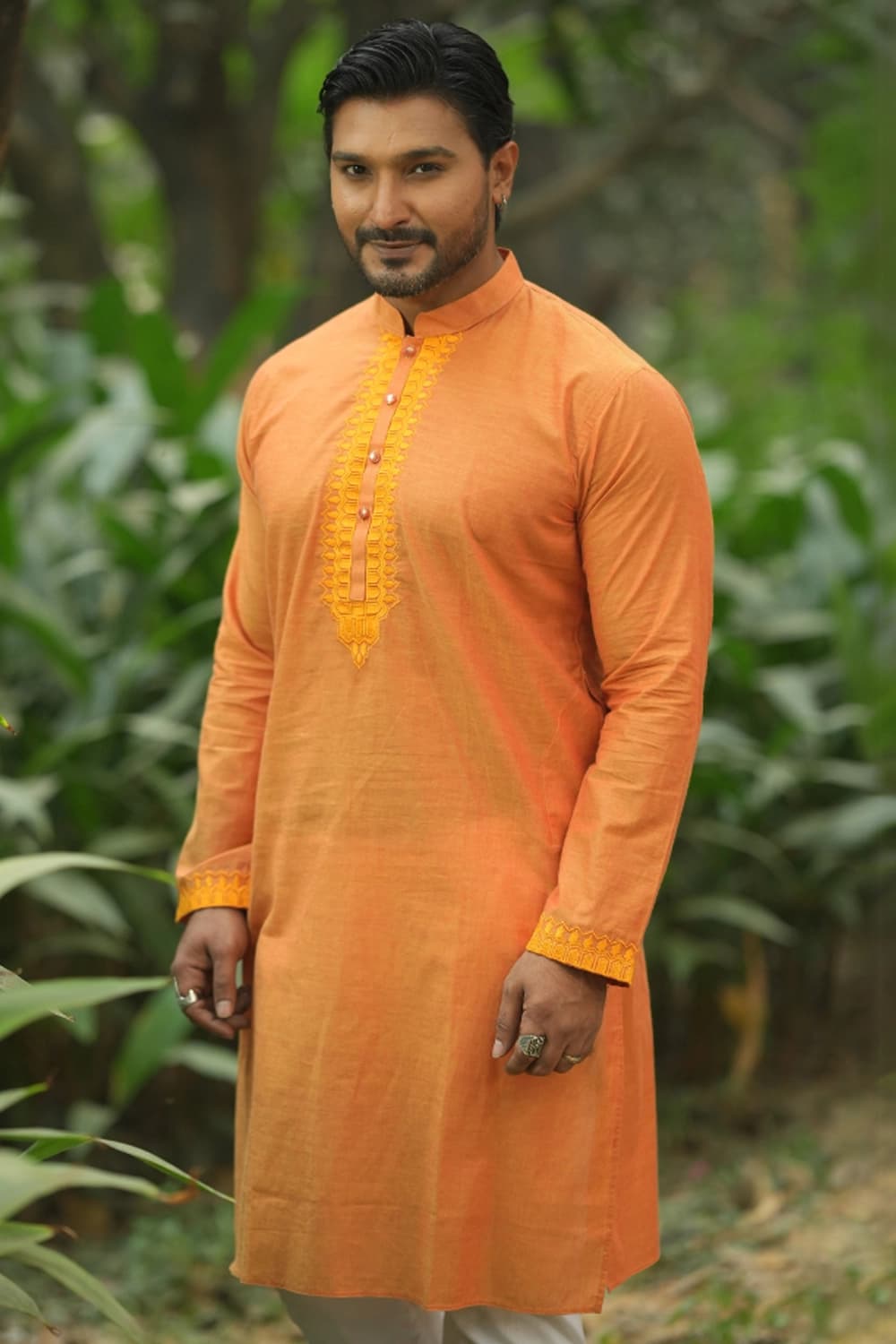 Stay stylish and comfortable with this cream Panjabi from BishwoRang. Made from soft Andy Cotton, it features fine cutwork and patchwork detailing—perfect for festive and formal occasions.