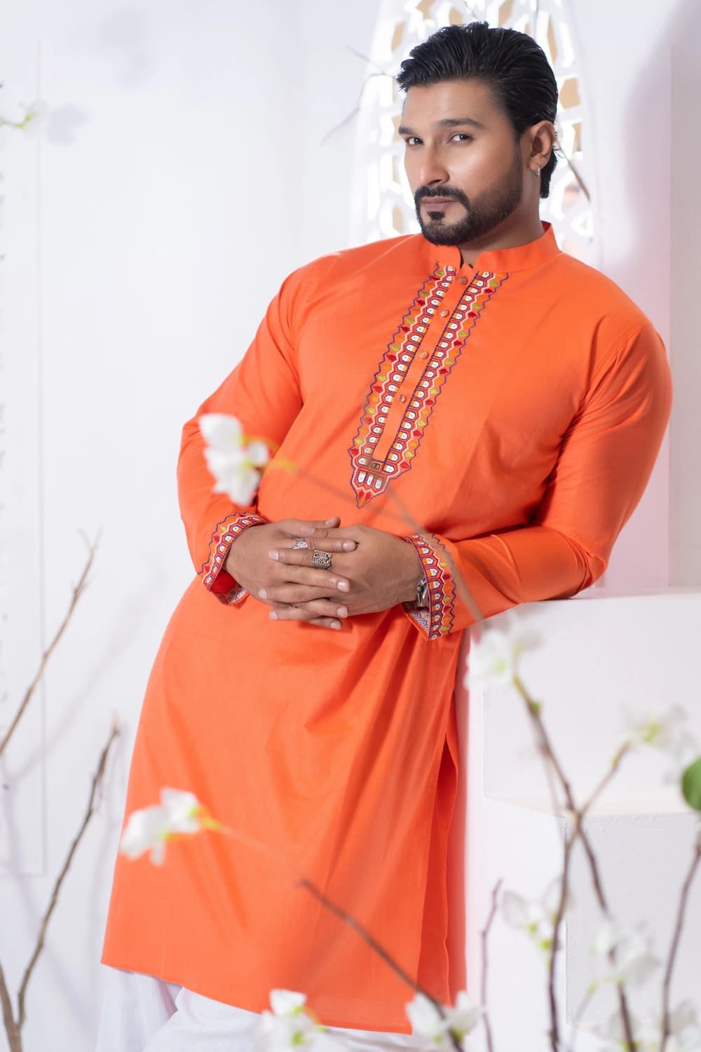 Stay stylish and comfortable with this cream Panjabi from BishwoRang. Made from soft Andy Cotton, it features fine cutwork and patchwork detailing—perfect for festive and formal occasions.
