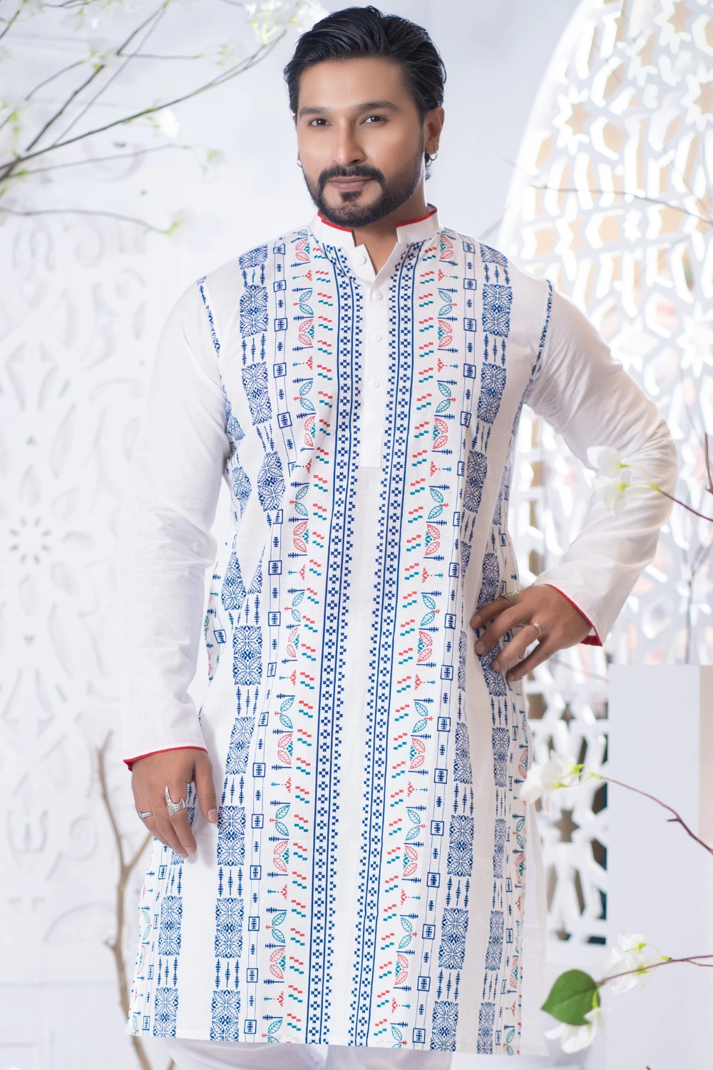 Stay stylish and comfortable with this cream Panjabi from BishwoRang. Made from soft Andy Cotton, it features fine cutwork and patchwork detailing—perfect for festive and formal occasions.