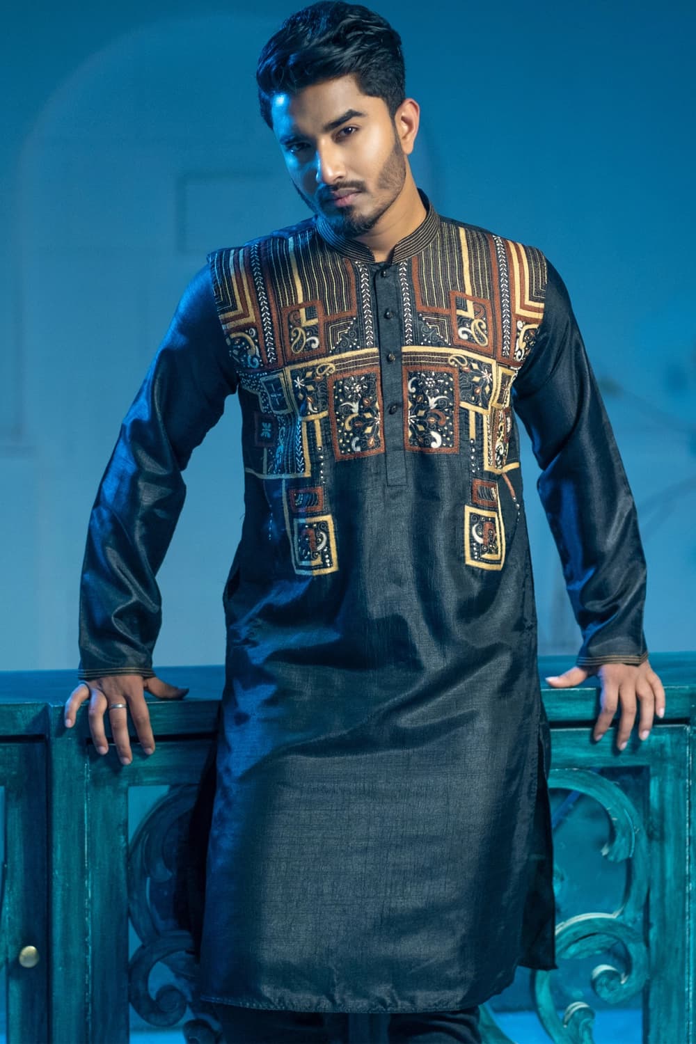 Product Name: Black Karchupi, J-Stich, Screen print Tussar silk Panjabi
