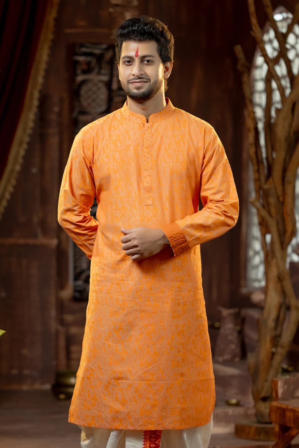 Stay stylish and comfortable with this Panjabi from BishwoRang. Made from soft Andy Cotton, it features fine cutwork and patchwork detailing—perfect for festive and formal occasions.
