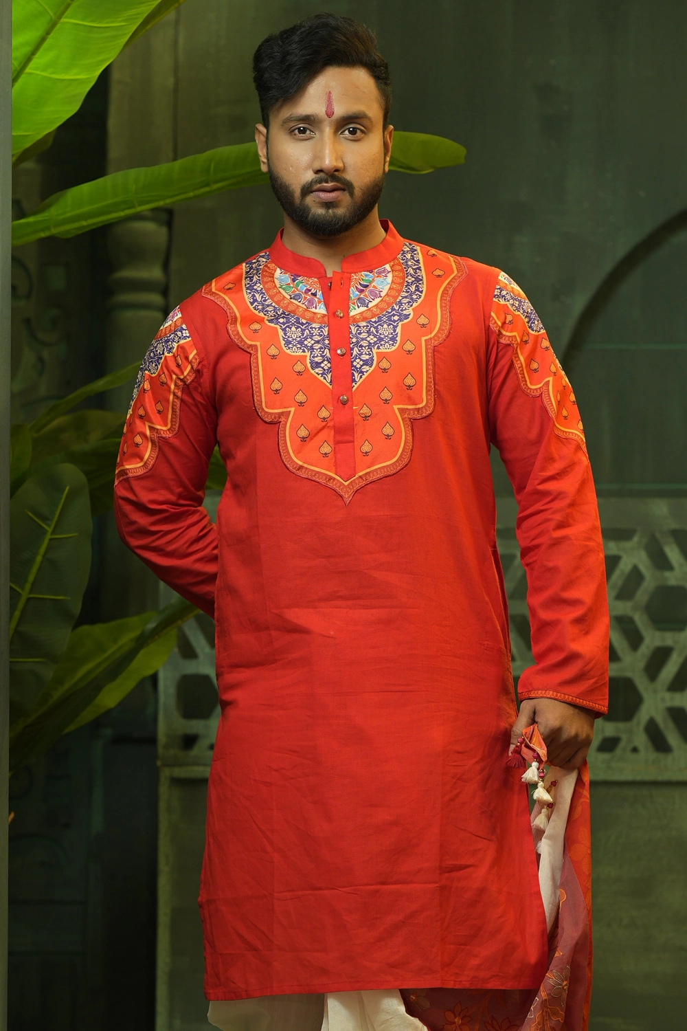 Stay stylish and comfortable with this Panjabi from BishwoRang. Made from soft Andy Cotton, it features fine cutwork and patchwork detailing—perfect for festive and formal occasions.