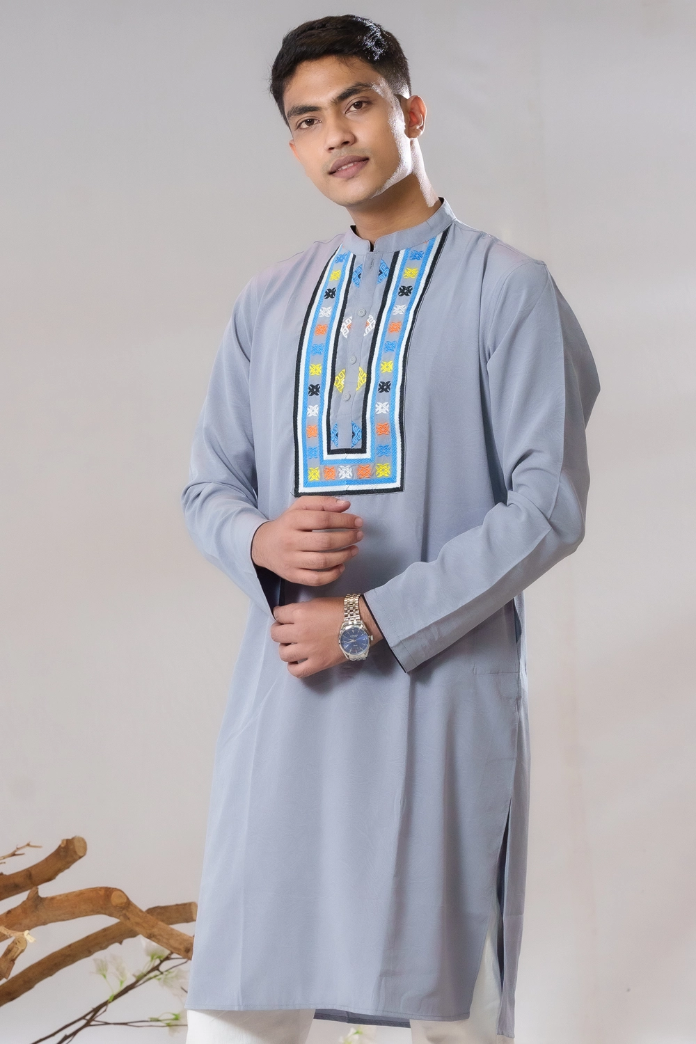 Stay stylish and comfortable with this Panjabi from BishwoRang. Made from soft Andy Cotton, it features fine cutwork and patchwork detailing—perfect for festive and formal occasions.