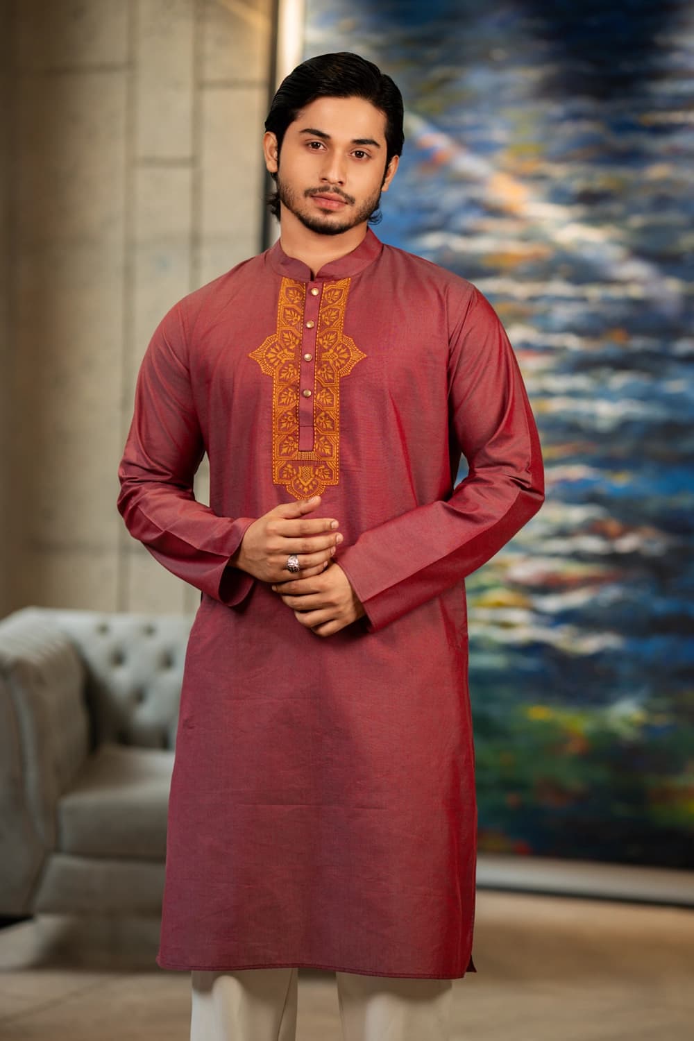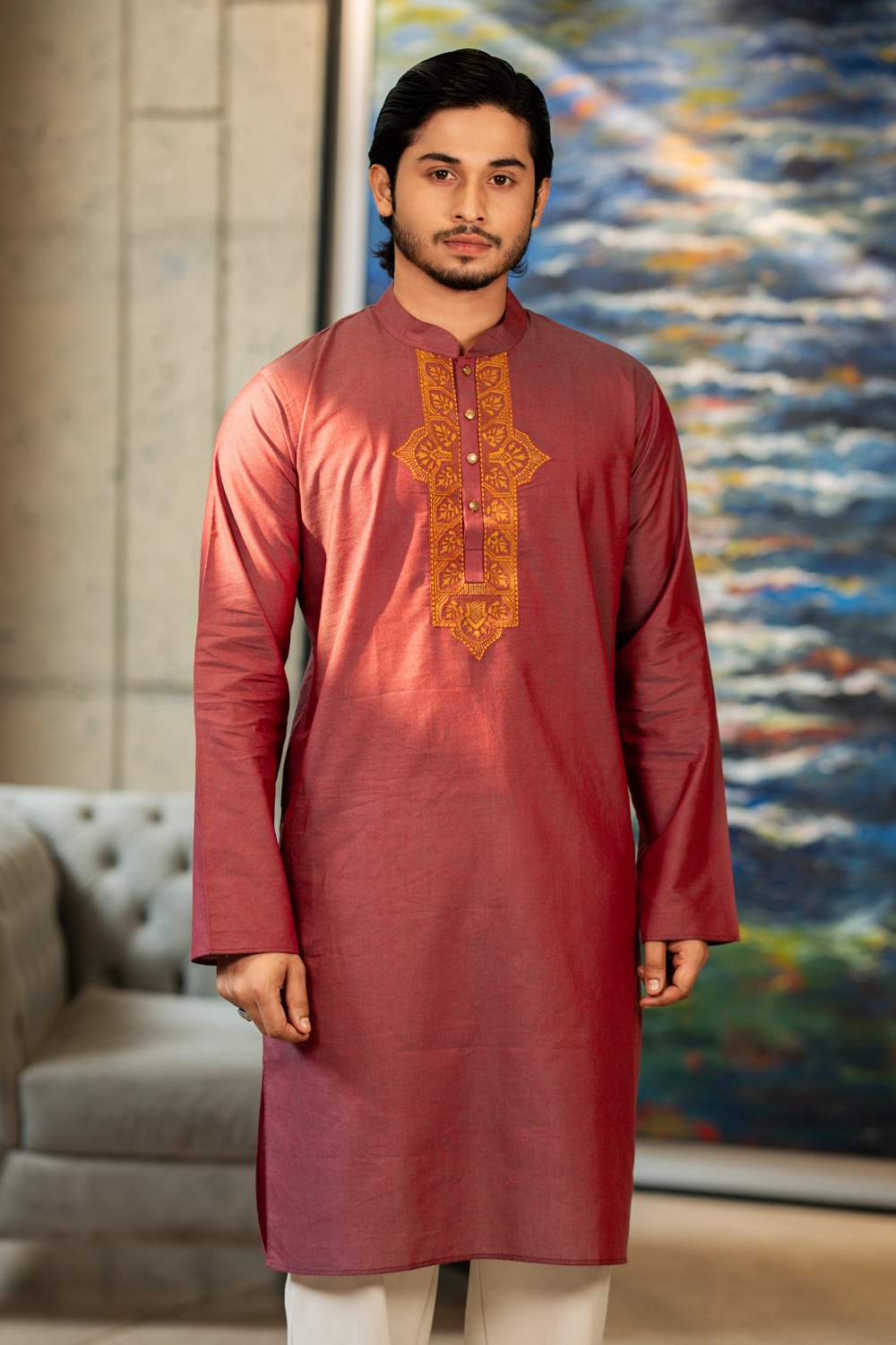 Stay stylish and comfortable with this Panjabi from BishwoRang. Made from soft Andy Cotton, it features fine cutwork and patchwork detailing—perfect for festive and formal occasions.