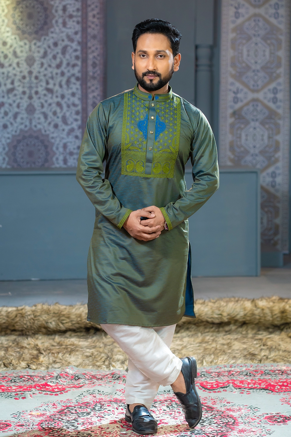 Stay stylish and comfortable with this Panjabi from BishwoRang. Made from soft Andy Cotton, it features fine cutwork and patchwork detailing—perfect for festive and formal occasions.