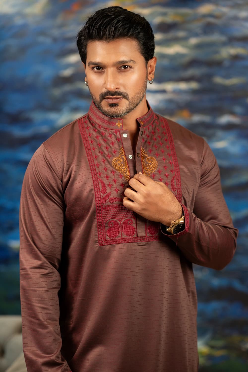 Stay stylish and comfortable with this Panjabi from BishwoRang. Made from soft Andy Cotton, it features fine cutwork and patchwork detailing—perfect for festive and formal occasions.