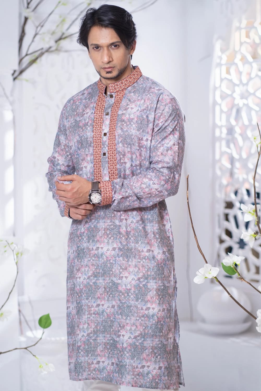 Stay stylish and comfortable with this cream Panjabi from BishwoRang. Made from soft Andy Cotton, it features fine cutwork and patchwork detailing—perfect for festive and formal occasions.