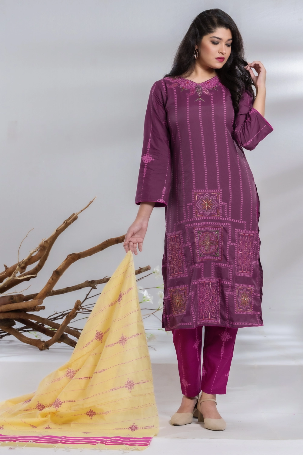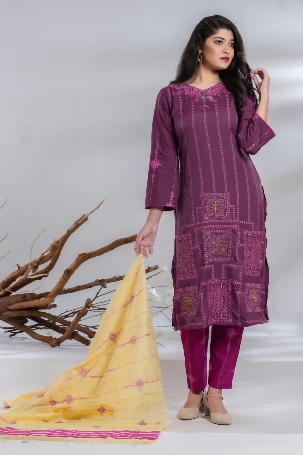 Elevate your elegance with Bishworang’s stunning three-piece set, crafted from premium fabrics. Featuring a beautifully designed kurta, matching bottom, and a stylish dupatta, this ensemble is perfect for any festive or casual occasion. Shop the latest three-piece dresses online and embrace timeless fashion.