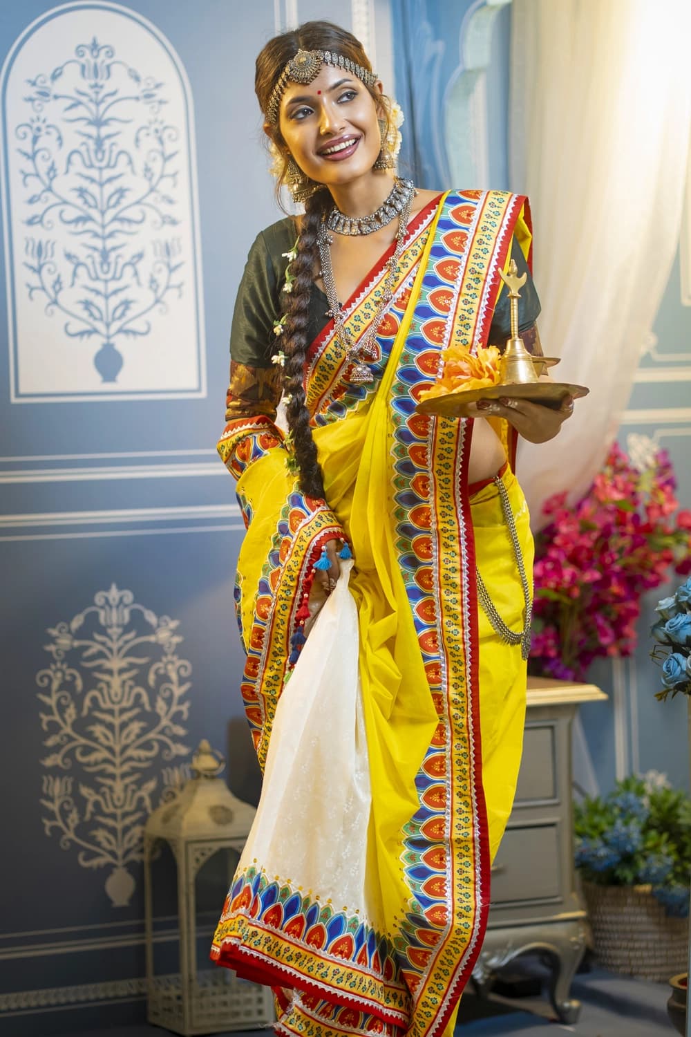 Celebrate festive occasions with the White & Yellow Half Silk Saree from Bishworang. Crafted with premium half silk fabric, this saree features exquisite cutwork, digital print, and handwork patchwork designs, combining traditional elegance with modern style.