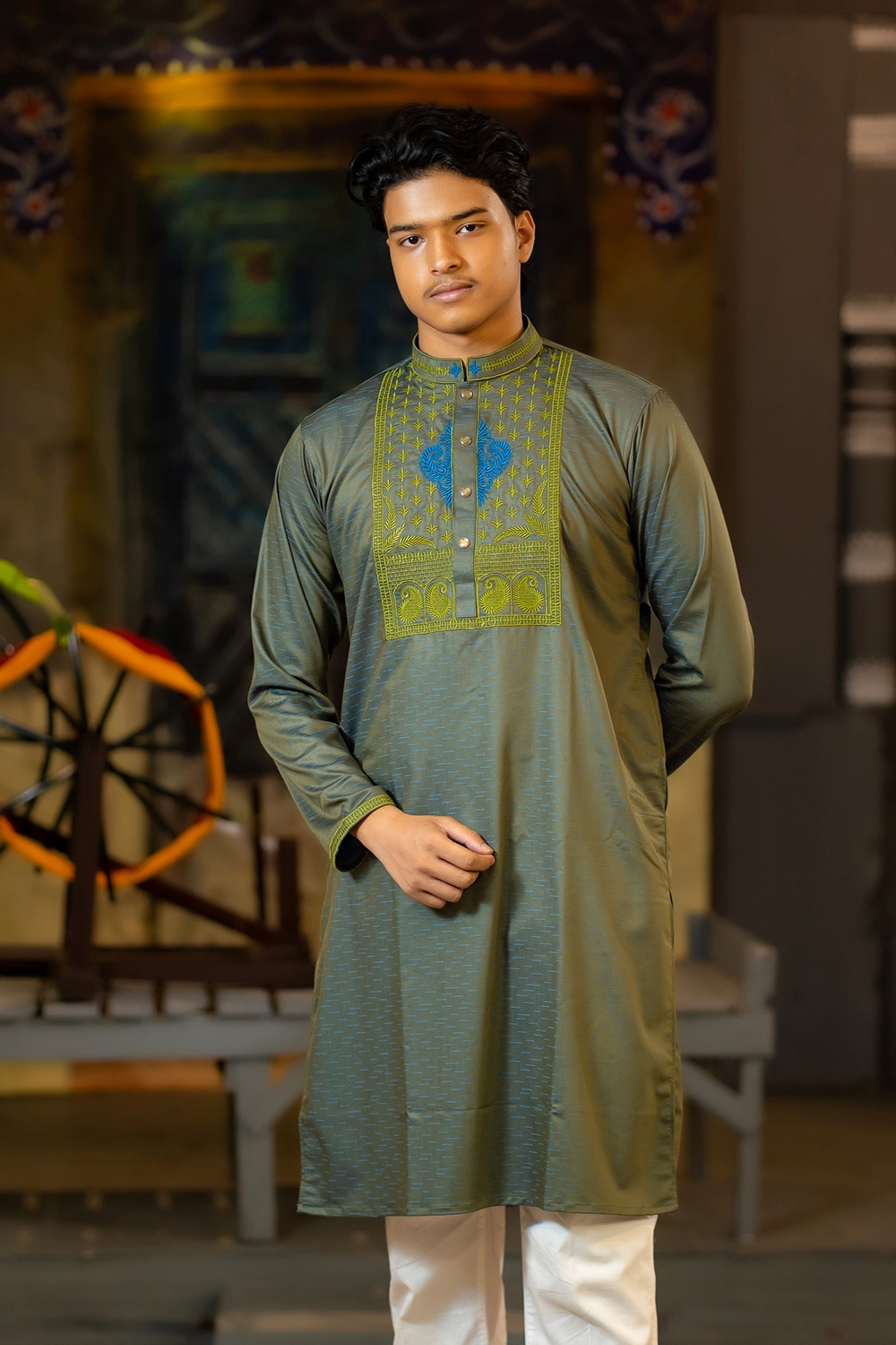 Stay stylish and comfortable with this Panjabi from BishwoRang. Made from soft Andy Cotton, it features fine cutwork and patchwork detailing—perfect for festive and formal occasions.